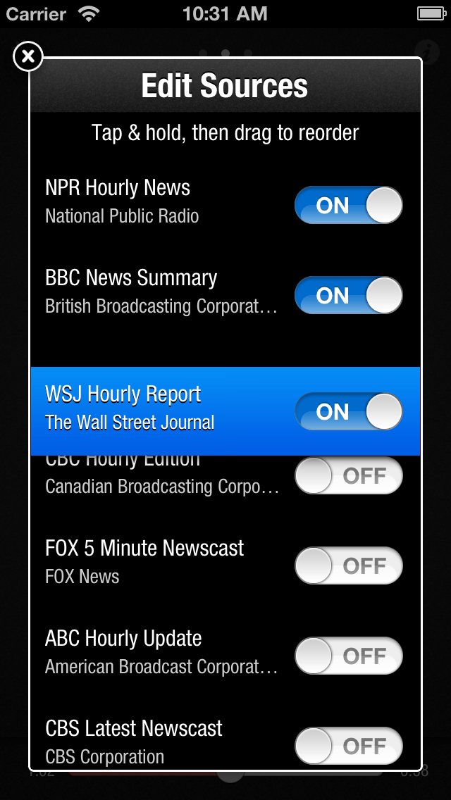 Choose from any or all of the available news podcast sources. You can enable, disable and reorder them any way you choose, so you only get the news that's important to you. You can even add your own custom podcast sources!